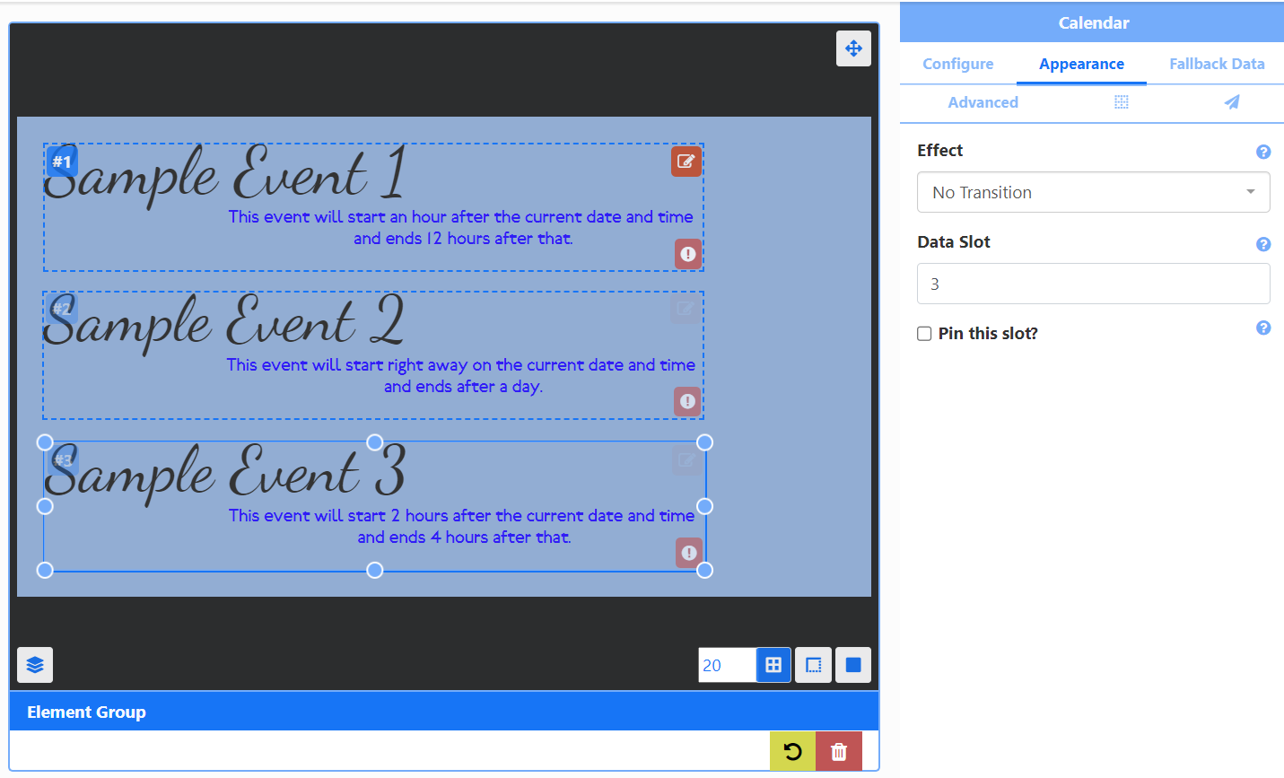 The Appearance tab includes options to configure how the data returned from the Element should look and includes transition effects and Data Slot configuration.