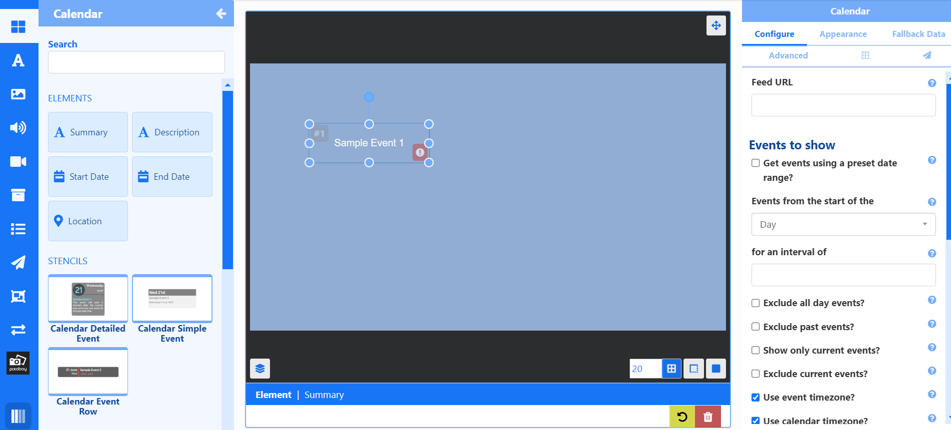 Selected Data Widgets include pre made designs of Element Groups called Stencils to assist Users with creating content simply and quickly: