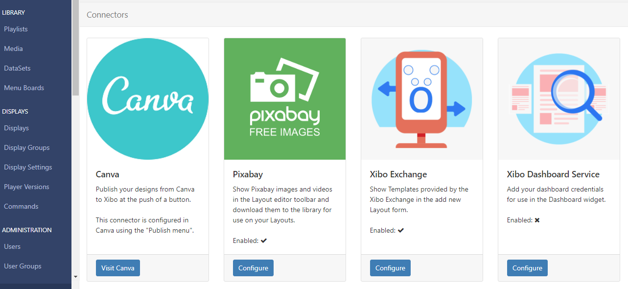 - Click the Configure button for the Xibo Dashboard Service connector: