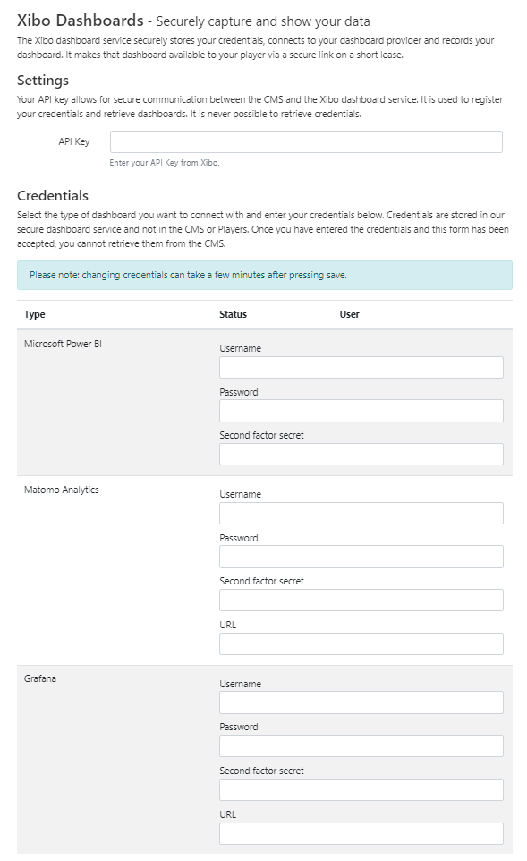Please see the following page for further information on obtaining a URL to use with this service, supported authentication mechanisms and possible limitations Xibo Dashboard Service