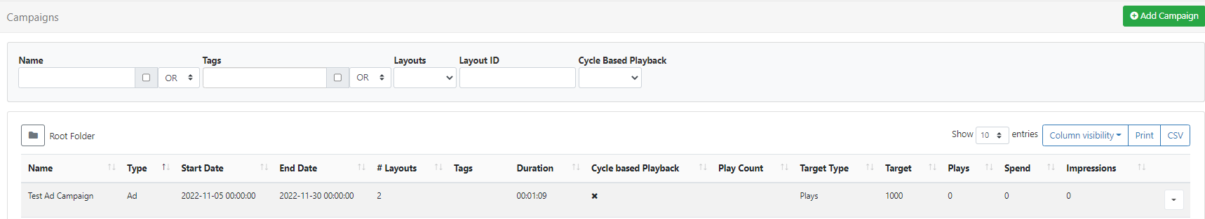 The Layout will be added to the Campaign which can be edited/deleted if required using the row menu: