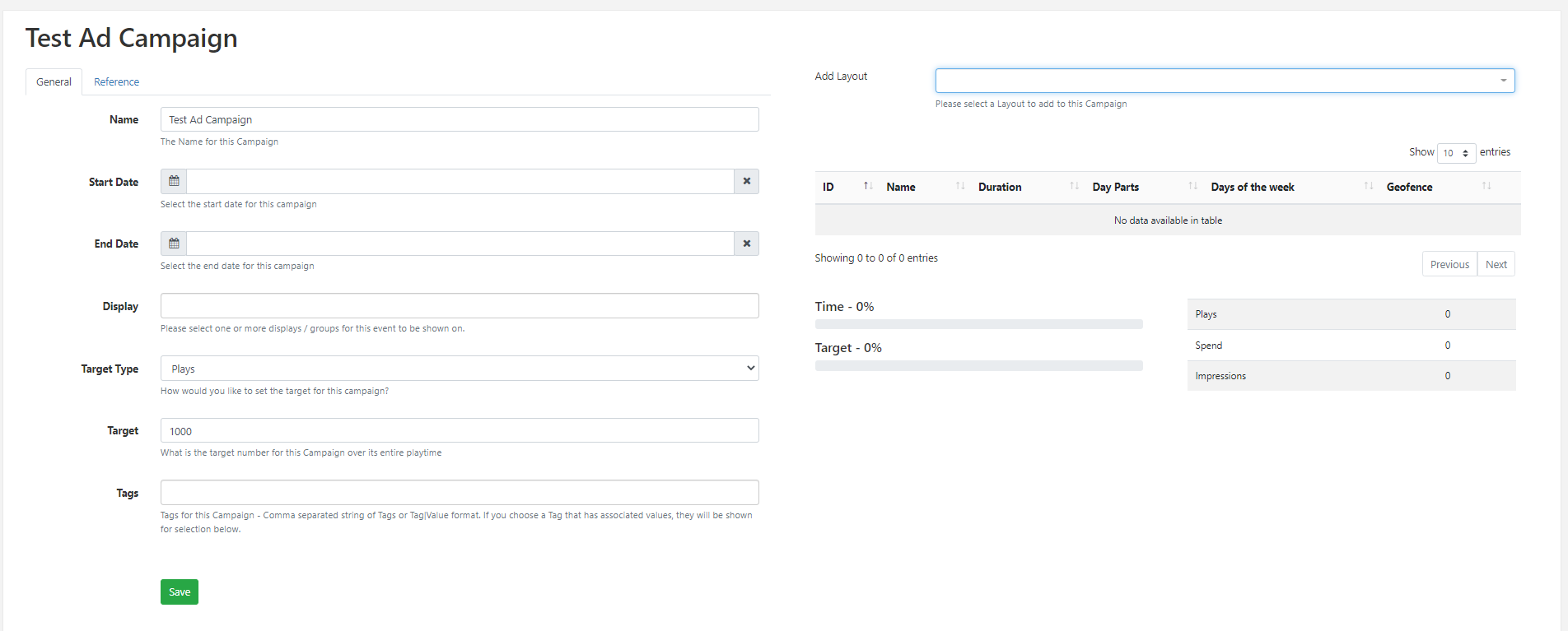 The Ad Campaign progress will be shown in the Campaigns grid and on opening the Ad Campaign, providing that Proof of Play has been set to ON for all Displays and Layouts selected for the Campaign. As well as Cost per play and Impressions per play fields are completed for all selected Displays.
