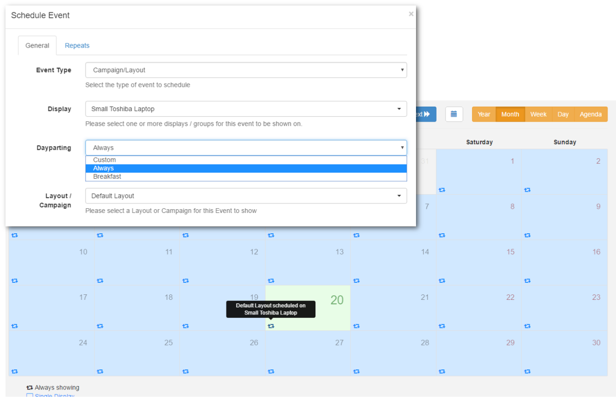 One of the many new and exciting features of 1.8 is Always Scheduling. This will ensure that the Campaign or Layout selected will Always be scheduled. Content will Always be shown on your displays.