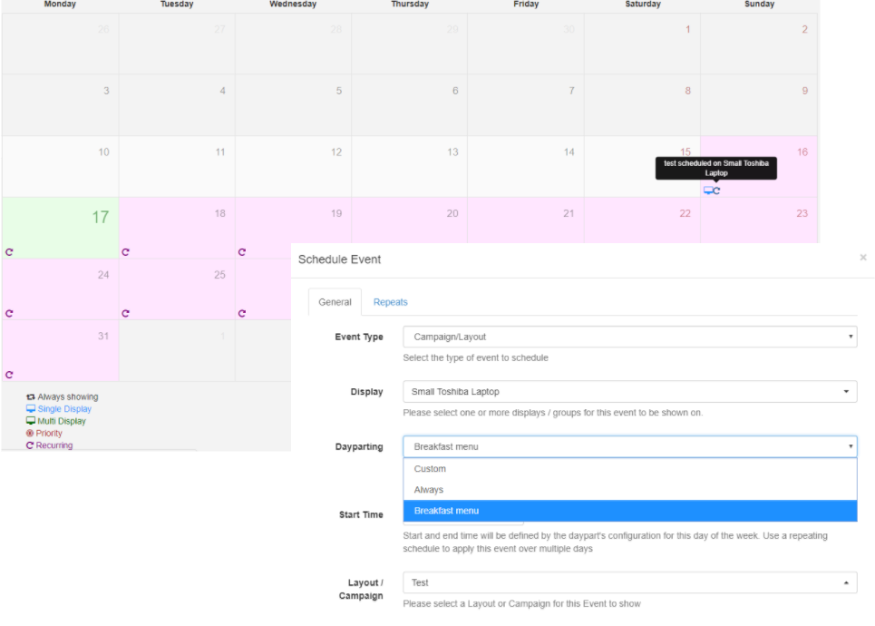 So what is Dayparting? Just like in broadcast programming Dayparting allows your scheduled content to be shown the to the right people, on the right day at the right time. Create and schedule your content into the Daypart and let Xibo do the rest!