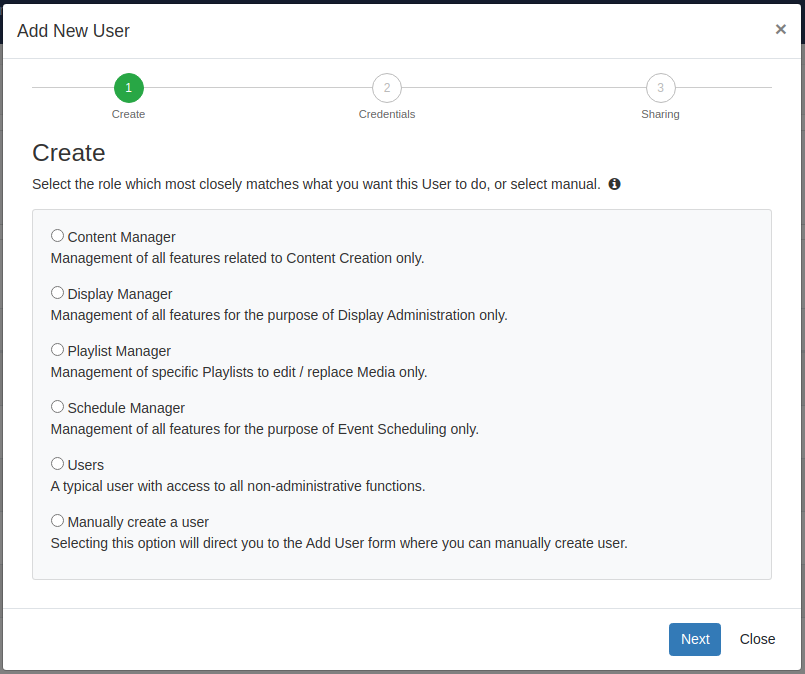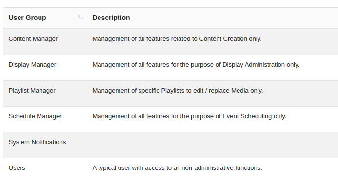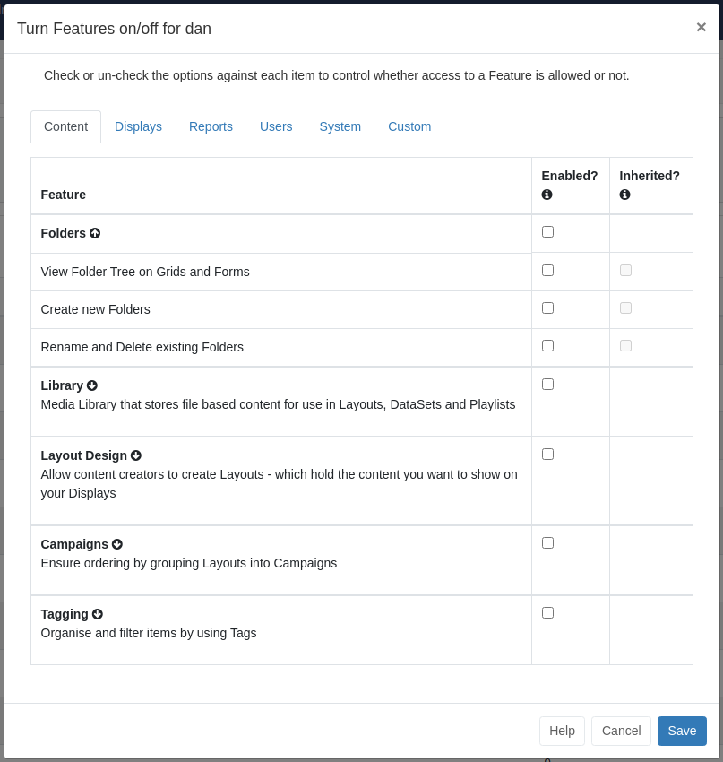 We've done away with the complicated page permissions model and streamlined into common sets of Features. These can be enabled/disabled on a User or a User Group and control exactly what users can see and do within Xibo.