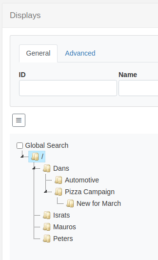 Folders are common across all of the core Xibo items, Layouts, Playlists, Library, Displays, etc. Each item can be in a named folder, or be in the / root folder, and folders can be shared with other Users and Groups.