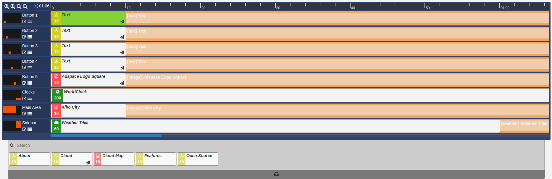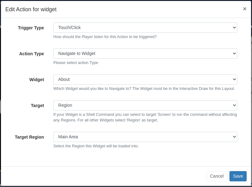 We support triggering by "Touch/Click" or "Web Hook", and Previous, Next, Navigate to Layout and Navigate to Widget action types. When navigating to a Widget, that Widget is added to the "interactive Drawer", accessible underneath the Region timeline. Widgets added here do not have to exist in the current Region timeline.